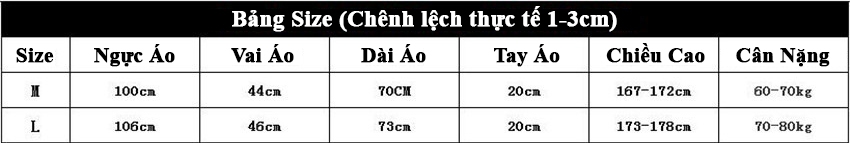 Số đo thực tế có thể chênh lệch 1-3cm so với bảng size.